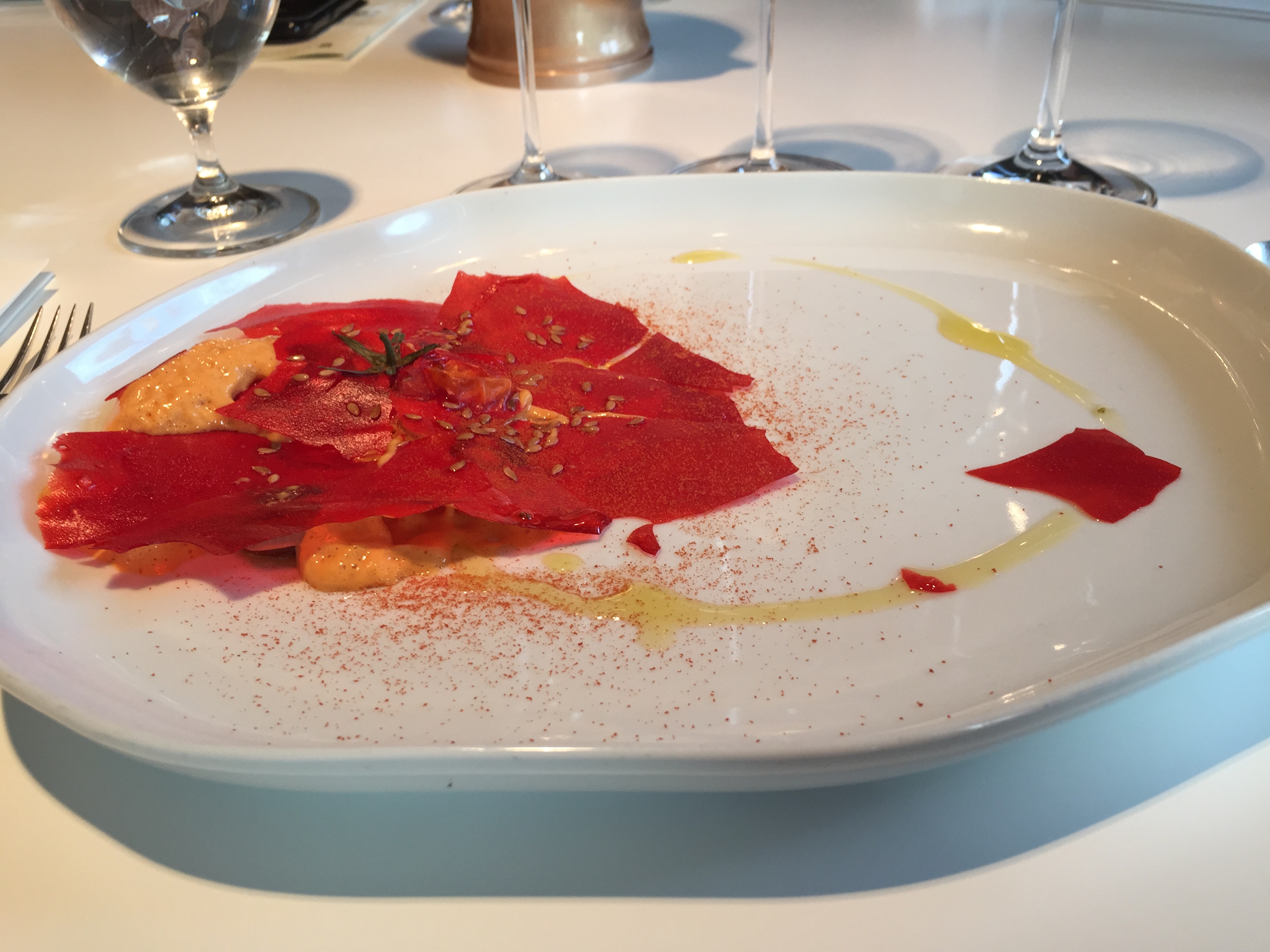 The theme at Quique Dacosta was Fronteras, translated as “borders,” but I might better call it “frontiers.” This was cuisine at its most refined and most creative, in some ways more of an intellectual experience. Precise attention to presentation and form in this meal. Everything from little puffs of cod, tuna belly with seaweed, a slice of dried octopus, to a beautiful crushed and dried tomato (the maître d’ came around with his hammer to do the crushing, one of my favorite courses), a langoustine with green curry, avocado and corn, to mushrooms served on the forest floor, a piece of completely black charred bread with romesco sauce for dipping, to a slender vase of roses with a tangle of apple in the center. Shown here the battered tomato, seaweed, part of one dish, and the wrapped langoustine.